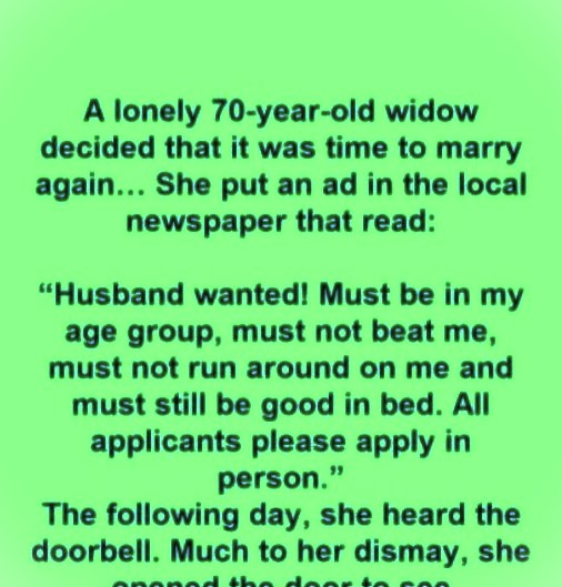 A lonely 70-year-old widow finally decided it was time to marry again, so she placed an ad in the local newspaper. It read: